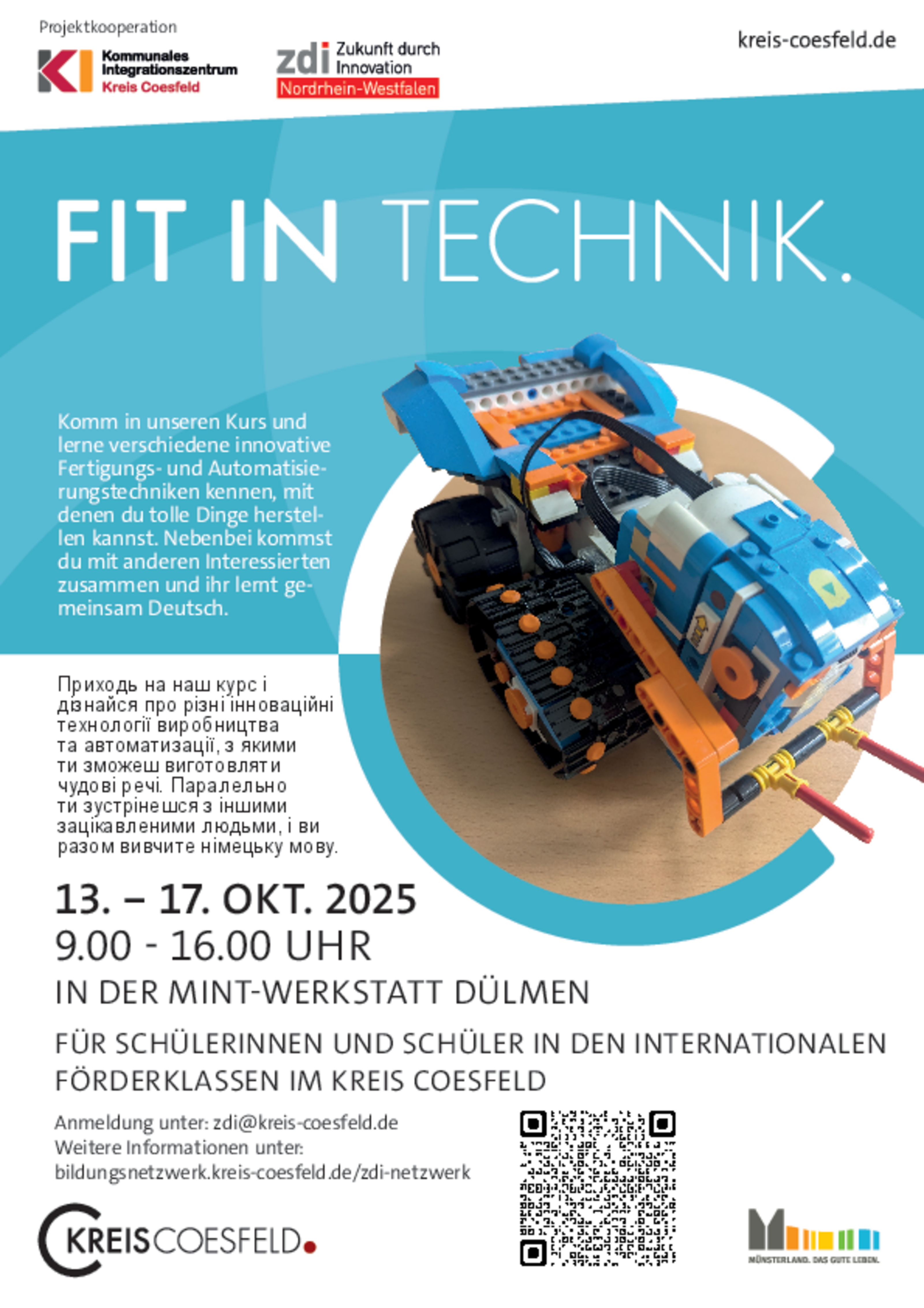 Dieser Kurs findet in Kooperation des zdi-Netzwerkes Kreis Coesfeld und des Kommunalen Integrationszentrums Kreis Coesfeld statt.